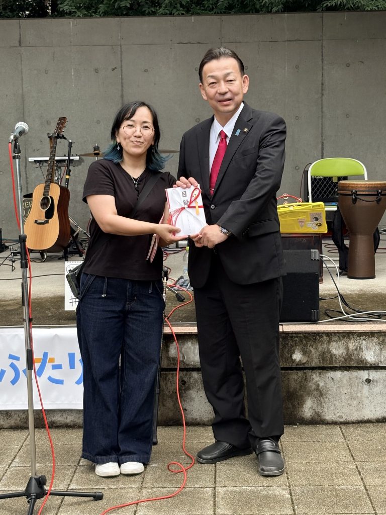 また、当日会場にて「おけがわ手づくりマーケット(菅又春香、岩崎かおる共同代表)」様から「桶川市子ども・子育て応援基金」にご寄付をいただきました。