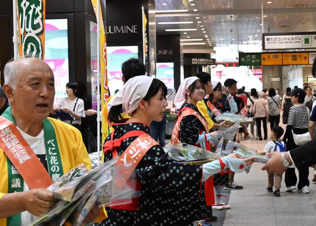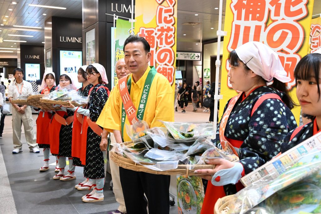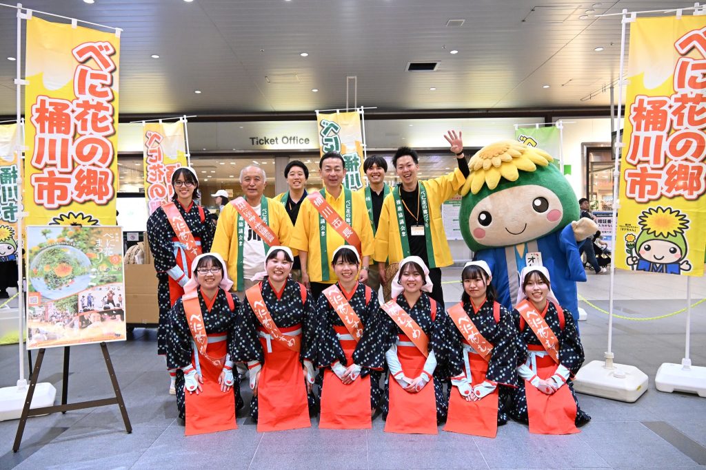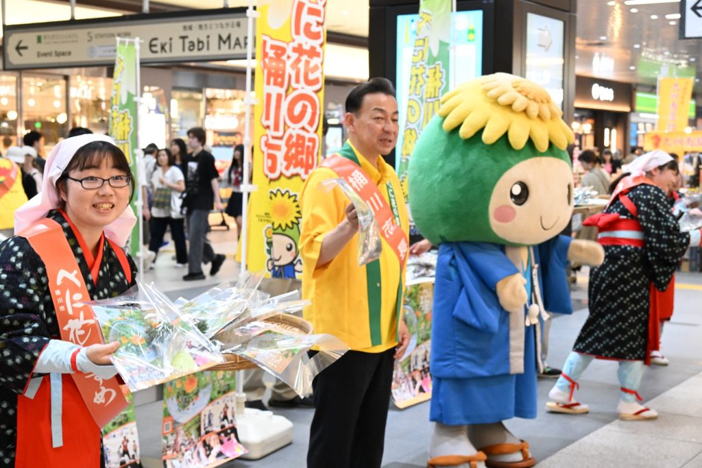 6月7日(土)、JR大宮駅構内にて、「べに花の郷づくり推進協議会」の澁谷光章商工会長と「べに花娘」に扮した市役所職員らとともに、「第28回べに花まつり」の駅頭PRを行いました。