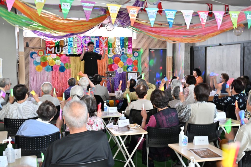 当日は、吉本興業のお笑いコンビ「レギュラー」による漫才や、マジックショーに続き、利用者の皆さんの楽器演奏や歌、踊り、更には、スタッフの方のDJパフォーマンスなどで会場は大いに盛り上がりました。