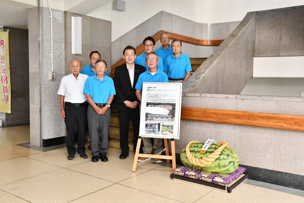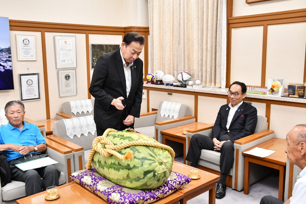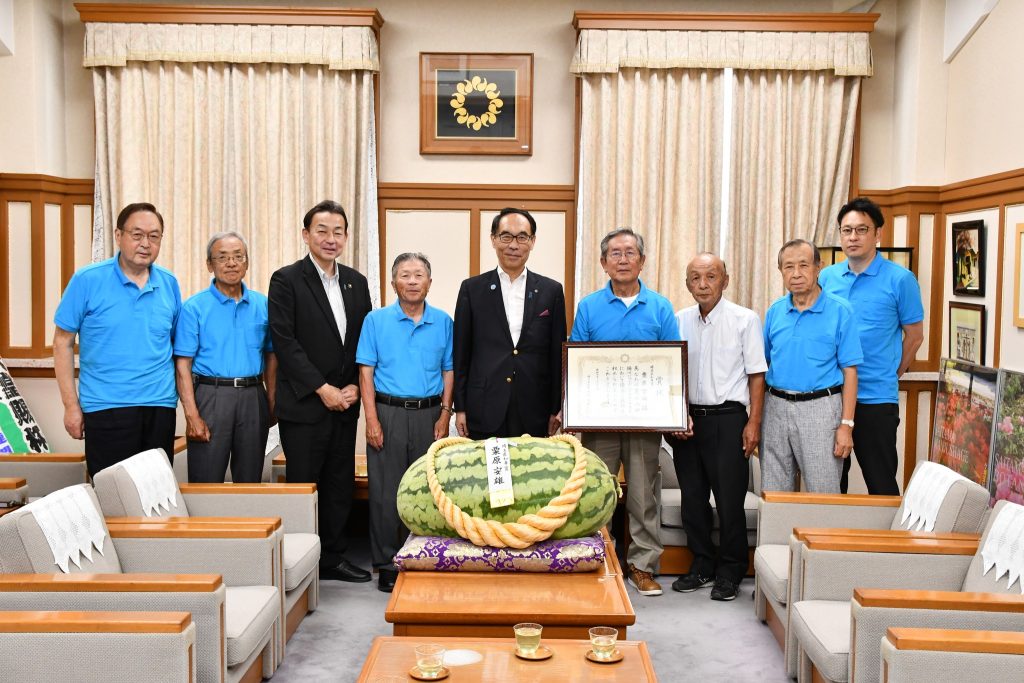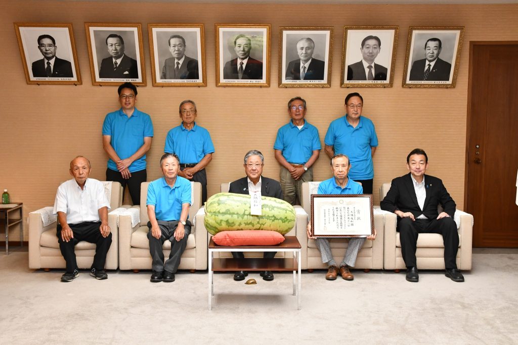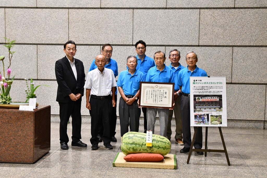 8月27日(火)、土曜日に行われたジャンボスイカコンテストで優勝(県知事賞受賞)した栗原安雄さんとジャンボスイカ愛好会役員の皆さんで大野元裕知事と飯塚俊彦県議会副議長を表敬訪問いたしました。(埼玉県議会議長賞は大隅俊和さんが受賞。)