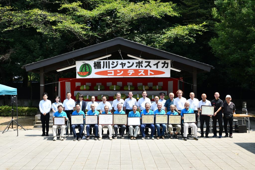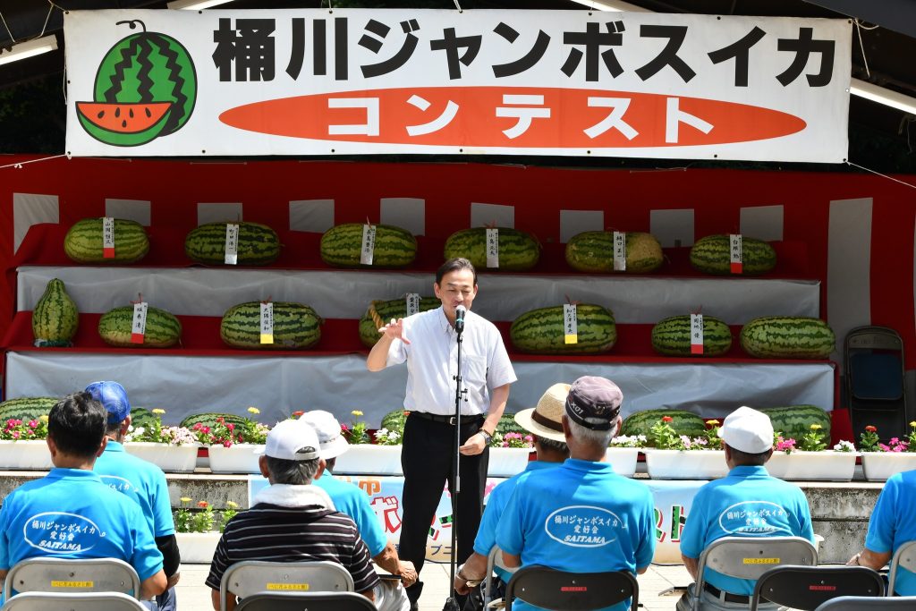 8月23日(土)、べに花ふるさと館にて「第18回桶川ジャンボスイカコンテスト」が開催され、今回は、67.43㎏のジャンボスイカを育てた栗原安雄さんが優勝(埼玉県知事賞)されました。