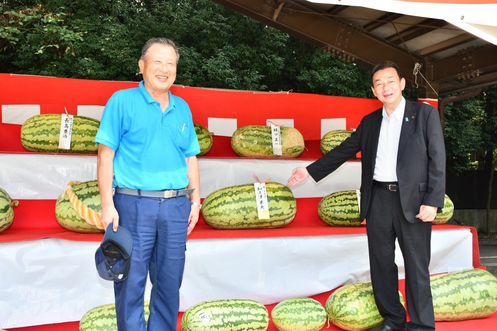 今回、市長賞を受賞された和久津孝夫さんのジャンボスイカ(52.83㎏)は、8月29日(金)まで市役所庁舎1階に展示しておりますので、皆様ぜひ、間近でその大きさを感じていただければと思います。