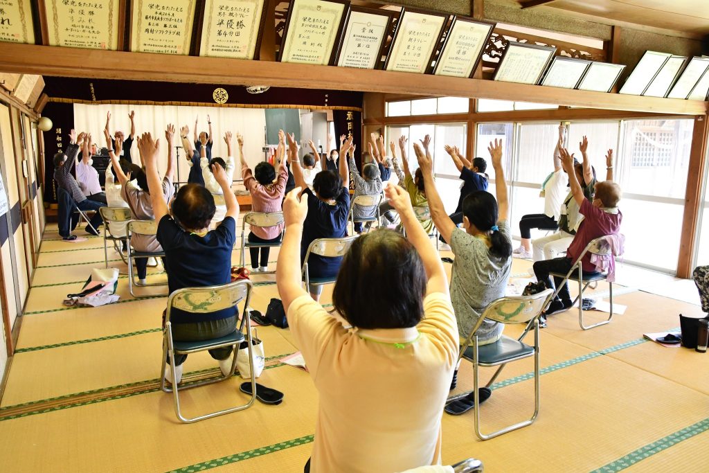 岡村区では、この度、「岡村いきいきクラブ」を設立され、ご近所型介護予防活動に取り組むこととなりました。当日は、30名を超す地域の皆様がお集りになり、皆で「100歳体操」等を行いました。
