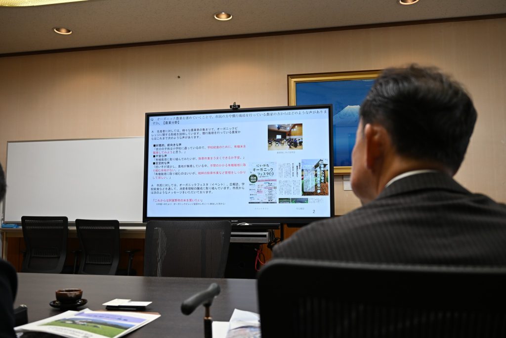 オーガニック給食は、市内農業者やJA等のご協力により、環境への配慮や食育、子育て環境の向上など、多角的視点から令和5年度より導入され、令和7年度には市内全小中学校に4か月分の有機米を提供できるようになりました。今後は有機野菜等の栽培を更に拡大していきたいとのことでした。