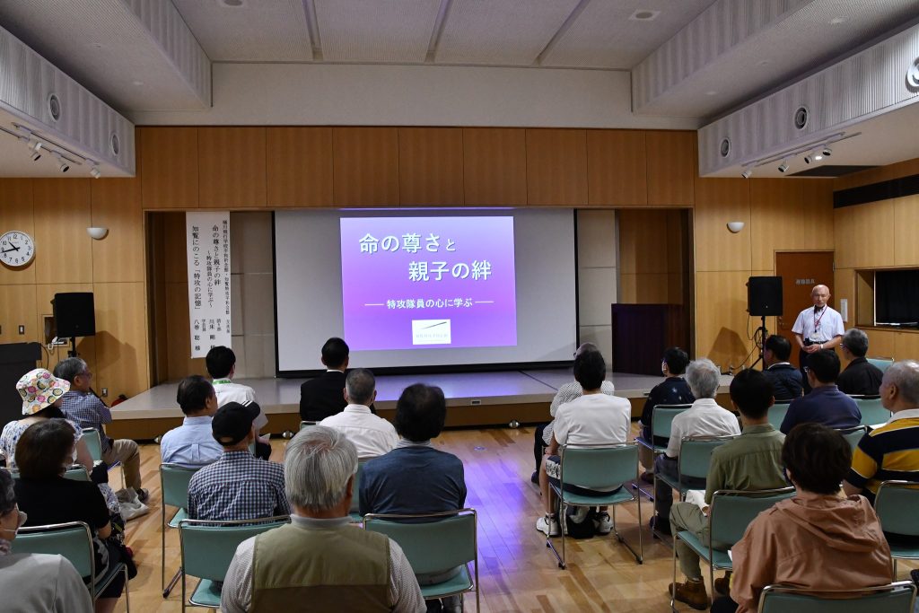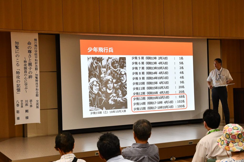 語り部の川床様の講話では、「命の尊さと親子の絆~特攻隊員の心に学ぶ~」と題して、当時の写真から読み解く若い特攻隊員たちの想い等についてのお話しや、家族に向けた遺書などが紹介されました。